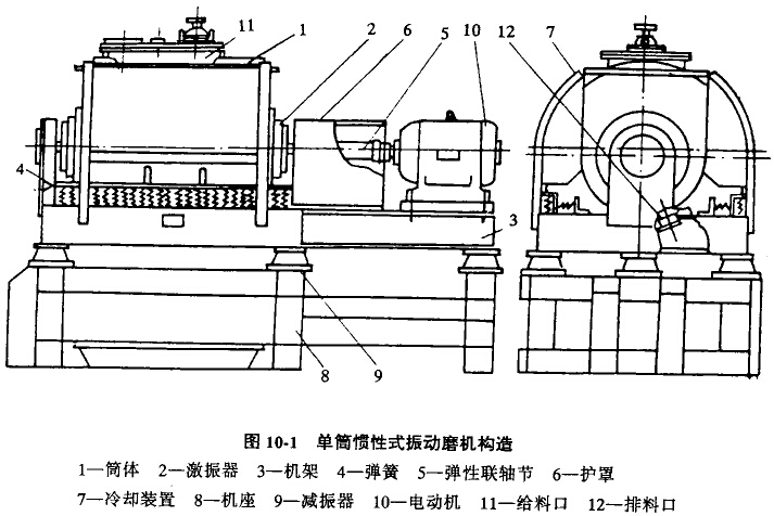 雙筒慣性式振動磨機的構造如圖10-3所示。它由機座1,筒體2,5,彈簧3,激振器4,萬向聯軸節6,支承板7,彈性聯軸節8和電動機9等組成。雙筒振動磨機的粉磨筒體為串聯方式上下布置,它們之間通過文承板7互連在一起,而支承板由彈簧3支承在機座I上。在支承板中部裝有激振器,激振器主動上裝有可調式偏心塊,激振器主鈾通過彈性聯軸節與電動機相連接。當電機通過彈性聯軸節帶動主軸轉動時,偏心塊產生離心力使筒體產生振動,物料從上筒體5的—端給入,在筒內受到粉磨介質的激烈振動沖擊磨剝作用粒度變小,并運動了筒體另一端,從排料門給入到筒體2進行粉磨,粉磨達到產品粒度要求p則從下筒體的誹料口排出。當產品粒度要求較粗時,也可采用兩個筒體并列布置的方式,被磨物料僅通過一個粉磨筒體,則可獲得兩倍的臺時產量。