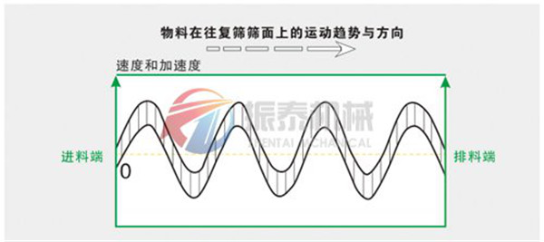 具體搖擺直線篩作業時物料的運動軌跡與滯留時間可以通過下圖及右圖來說明: